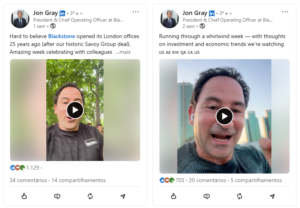 Líderes internacionais como Jamie Dimon (JPMorgan Chase), Daniel Shapero (LinkedIn) e William Peake (Harneys), começaram a aparecer em vídeos curtos — muitas vezes gravados no celular, sem roteiro — compartilhando atualizações sobre a empresa, reflexões pessoais ou insights sobre o mercado.